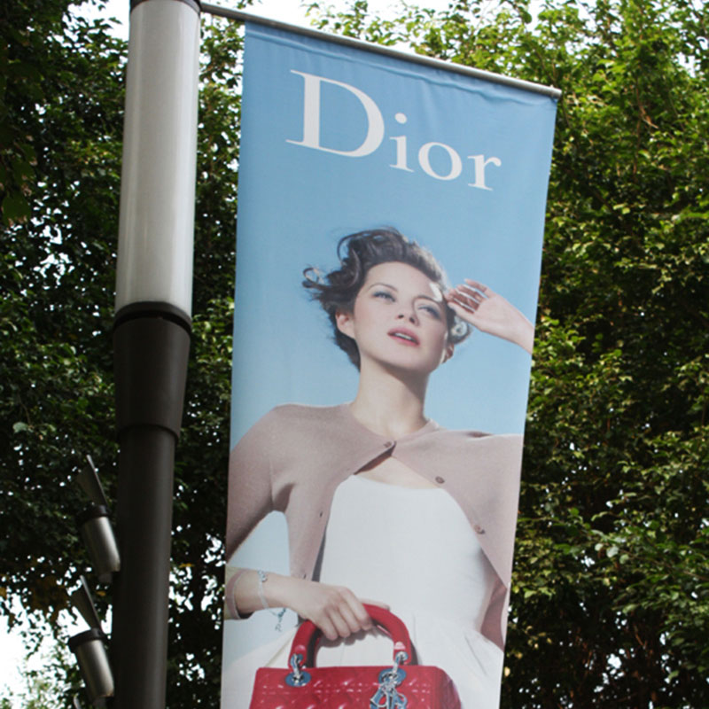 雙面吊旗噴繪,可以兩面噴繪,廣告效果好,畫(huà)面不卷邊,平整。是商場(chǎng)中庭吊旗應(yīng)用的經(jīng)典案例。也廣泛用于銀行、賓館、寫(xiě)字樓的窗簾,以及燈桿旗,既能做廣告,又能遮光。
