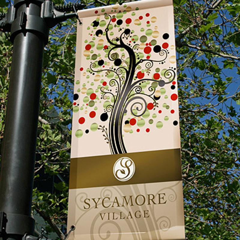 雙面吊旗噴繪,可以兩面噴繪,廣告效果好,畫面不卷邊,平整。是商場中庭吊旗應用的經典案例。也廣泛用于銀行、賓館、寫字樓的窗簾,以及燈桿旗,既能做廣告,又能遮光。